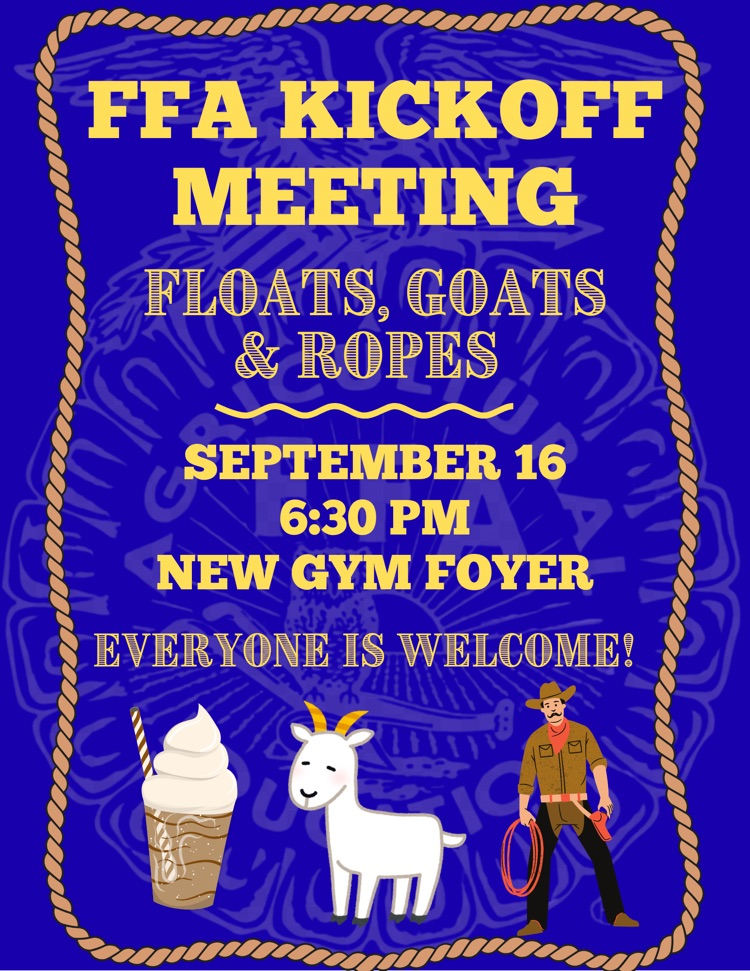 ‘Ewe’ won’t want to miss the May FFA Kickoff Meeting in 3 days! Join us for Floats, Goats, & Ropes on September 16 at 6:30 in the new gym foyer. It’s going to be ‘baa-rilliant!’ 💛💙 #MayFFA #KickoffCountdown